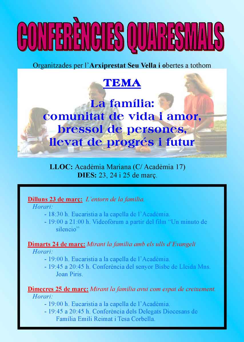 La familia centrará la temática de las Conferencias Cuaresmales organizadas por el Arciprestazgo Seu Vella, entre los días 23 y 25 de marzo, en la Casa de la Iglesia-Academia Mariana.