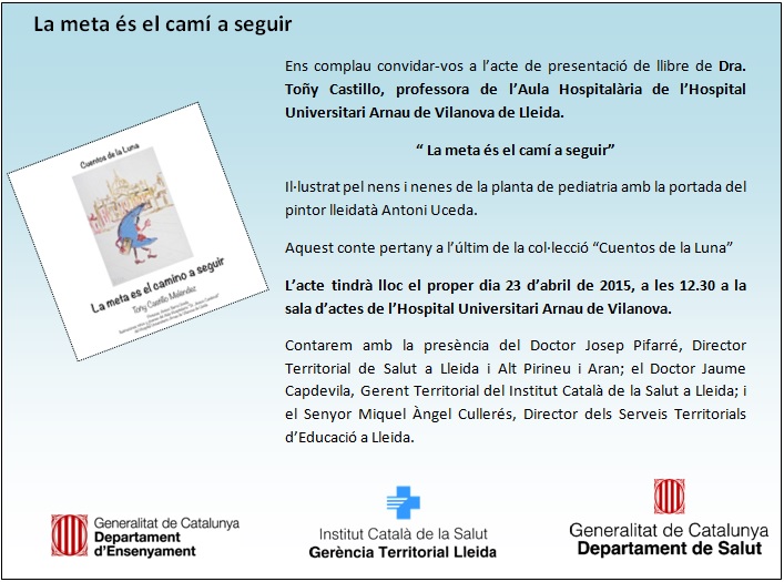 El día 23 de Abril, coincidiendo con la festividad de Sant Jordi, a las 12.30 h, en la Sala de Actos del Hospital Universitario Arnau de Vilanova de Lleida, se presentará el cuento La meta es el Camino a Seguir; un cuento donde la amistad y el respeto es el eje conductor. Un cuento que regaló padre Àngel Escales al Papa Francesc, al ser recibido en audiencia en el Vaticano.