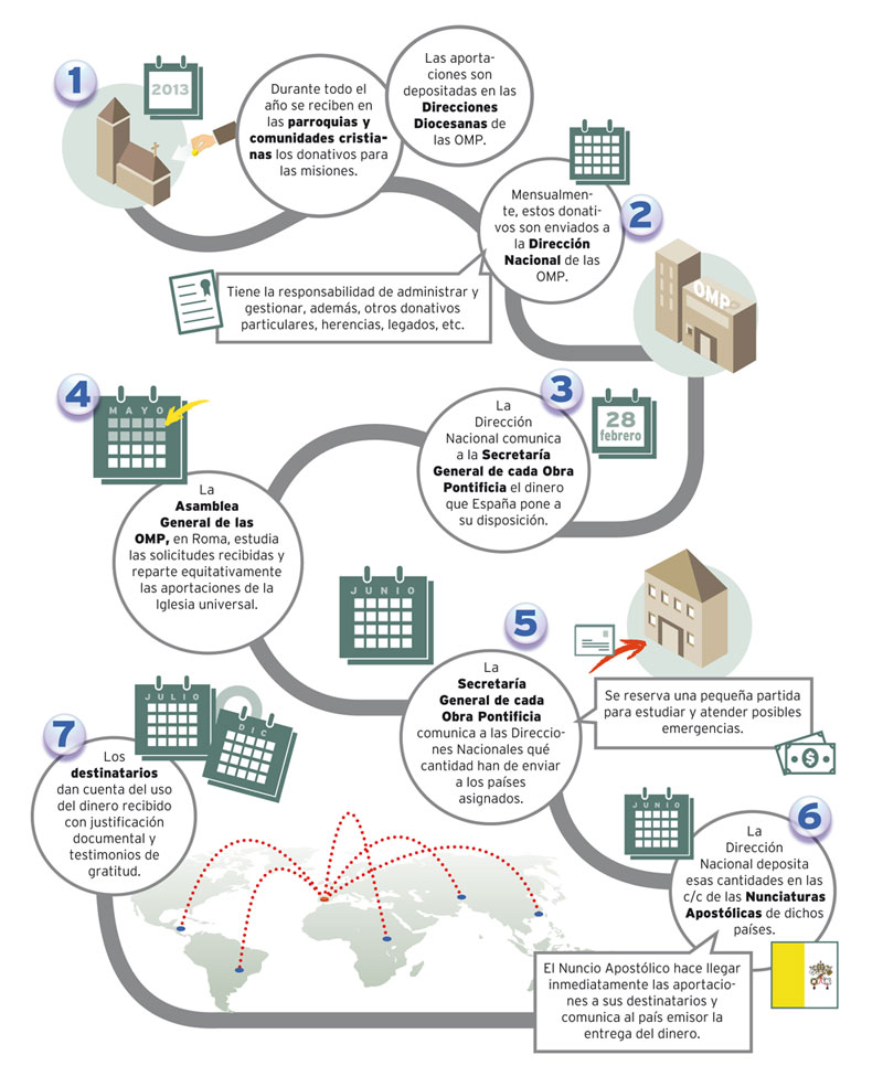 Vuestra colaboración está abierta el resto del año, no sólo a un día concreto. Así pues, si queréis, podéis seguir haciendo vuestras aportaciones a BBVA SE29 0182 5938 9100 1050 7400. Indicando DOMUND y quién hace la aportación. Ahora bien, también nos gusta saber el destino de los recursos que destinamos y cómo se utilizan. Hemos elaborado una infografía para explicar el recorrido que hace el dinero que se entrega y su destino final.