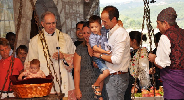 El rector del santuario, mons. Javier Cremades, celebró la misa con la que daban comienzo los actos y en la que cantó la Coral Montisonense. En la homilía Cremades subrayó el carácter festivo y tradicional del evento: “Esta Madre de Torreciudad recibe desde hace nueve siglos el cariño y la devoción de los vecinos de la zona. Como vosotros hoy, han ofrecido a la Virgen el regalo de Dios que supone la llegada de un hijo. Y Ella siempre da más y nos ayuda a revolucionar el mundo haciendo el bien”.