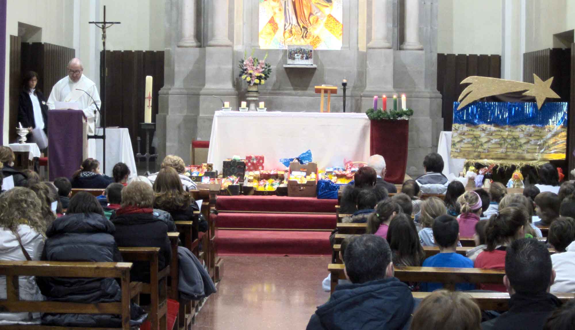 Del polideportivo se fue a la iglesia del pueblo. Los niños de catequesis de los diferentes pueblos construyeron las figuritas del pesebre que, poco a poco se fueron colocando en el establo que se había preparado en el altar mayor: pastores, reyes, Josep y María y el Niño, ovejas, buey y mula y por fin los ángeles. El nacimiento quedó muy bonito. Una vez instalado el pesebre los diferentes pueblos hicieron una ofrenda al Niño Jesús con productos de la tierra o típicos de Navidad para fueran repartidos entre las personas necesitadas.