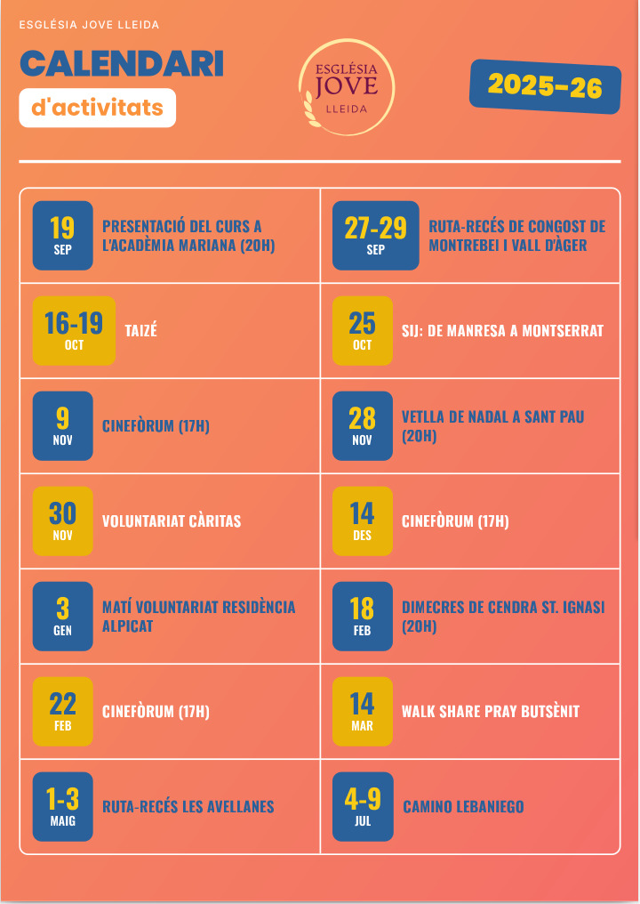 |23-09-25| Rutes, cinefòrums, voluntariats o recessos són algunes de les activitats que Església Jove de Lleida ofereix als joves per aquest curs escolar. Una dotzena de persones, entre representants de la diòcesi, d'escoles, de Càritas o de parròquies, van presentar el calendari el divendres 19 de setembre a la Casa de l'Església i que podeu consultar en la imatge adjunta. D'altra banda, l'entitat també organitza una sèrie de trobades amb missa a la parròquia del Carme cada quinze dies i que comencen el 24 de setembre. Podeu obtenir més informació clicant aquest enllaç.