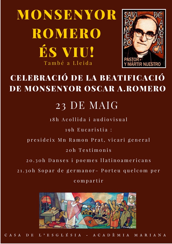 El dissabte 23 de maig, la Casa de l’Església-Acadèmia Mariana, acollirà uns actes celebratrius dedicats a l’arquebisbe de San Salvador Òscar Romero, amb motiu de la seva beatificació, el matí d'aquell mateix dissabte a San Salvador (vídeo)