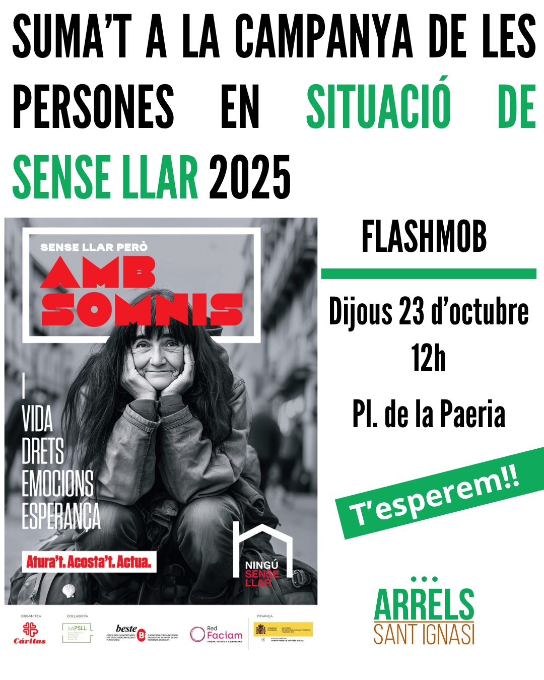 |16-10-25| Arrels Sant Ignasi, Càritas, la Fundació Jericó, la Fundació Entre Tots i per al Bé de Tothom (Llars del Seminari) y Sant Joan de Déu Terres de Lleida, un año más, volverán a salir a la calle para apoyar la Campaña de las Personas Sin Hogar 2025. Es una campaña organizada por las diferentes redes de entidades dedicadas al sinhogarismo en todo el estado y que, además de acoger y acompañar, creen que es imprescindible sensibilizar e incidir para generar cambios en la sociedad que sean realmente transformadores. La campaña de este año lleva el nombre de "Sin hogar pero con sueños. Y vida, derechos, emociones y esperanza", esta resalta que las personas que se encuentran en situación de calle no son solo personas sujetas a necesidades, sino que también tienen sueños y objetivos de vida. Así, el jueves 23 de octubre a las 12.00 h en la Plaza Paeria darán eco de esta situación con un flashmob y denunciarán la vulneración de los derechos más básicos.