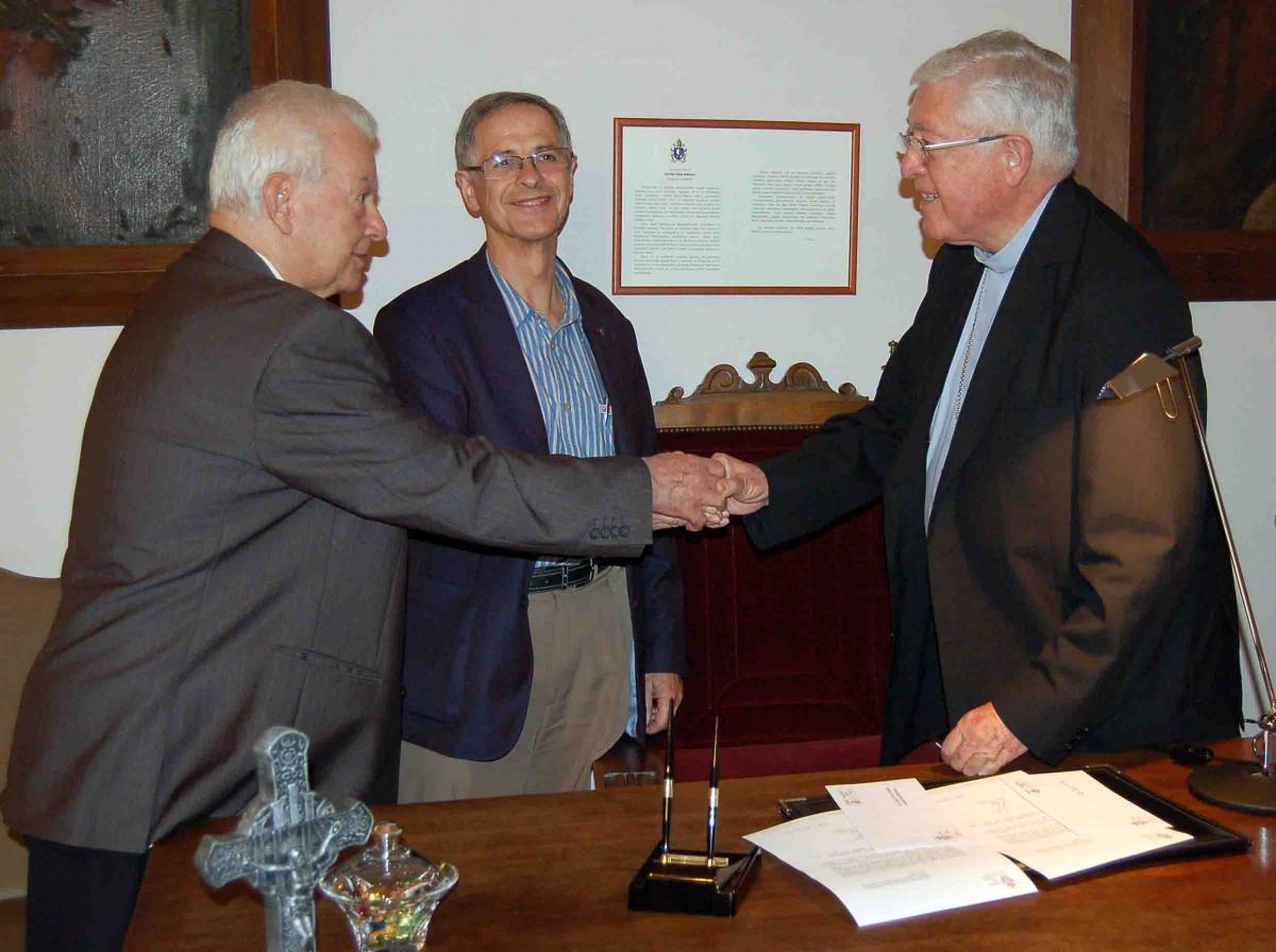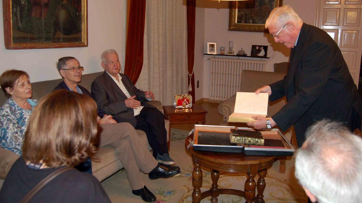 Mn. Gené, que fue director de la Academia Mariana hasta el 2012, hizo la entrega formal en el despacho del obispo Joan, donde firmaron un documento de entrega y recibimiento por parte de los responsables actuales de la institución mariana, en presencia de la secretaría de la Academia, Anna Maria Gaya; del miembro de la junta directiva, Xavier Terrado, y de Mari Carme Sabador, que ha sido la gran colaboradora de Mn. Gené todos estos años.